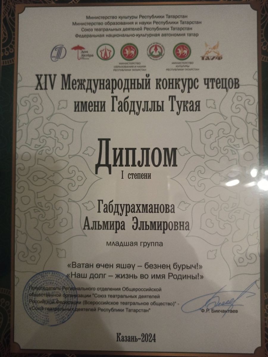 Сегодня в доме Актёров имени М. Салимжанова прошёл XIV международный конкурс имени Г. Тукая. Ученица 3А класса Габдурахманова Алъмира заняла 1 место. Поздравляем!!! Мы молодцы.