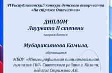 Ученица 3Е класса Камила Мубаракзяновв стала лауреатом 2 степени Республиканского конкурса детского творчества «На страже Отечества»!