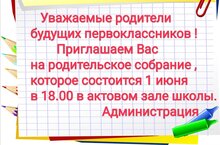 Уважаемые родители будущих первоклассников! Приглашаем Вас на собрание, которое состоится 1 июня в 18.00 в актовом зале школы. При себе иметь бахилы.