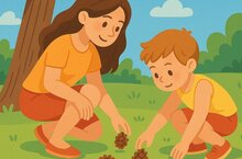 - Игра «Найди и покажись» развивает внимательность и знание окружающей среды. Ребята ищут определённые предметы (шишки, цветы и т.д.) и описывают их. Игра подойдёт для детей разных возрастов и поможет развить наблюдательность, память и речь;