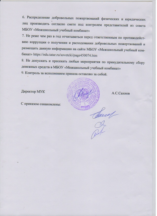 Приказ об организации антикоррупционной деятельности в МБОУ МУК Советского района г.Казани №94 от 10.10.2014 г. (Приложение к приказу- план мероприятий по предупреждению коррупционных правонарушений) (в jpg формате: стр.1, стр 2)