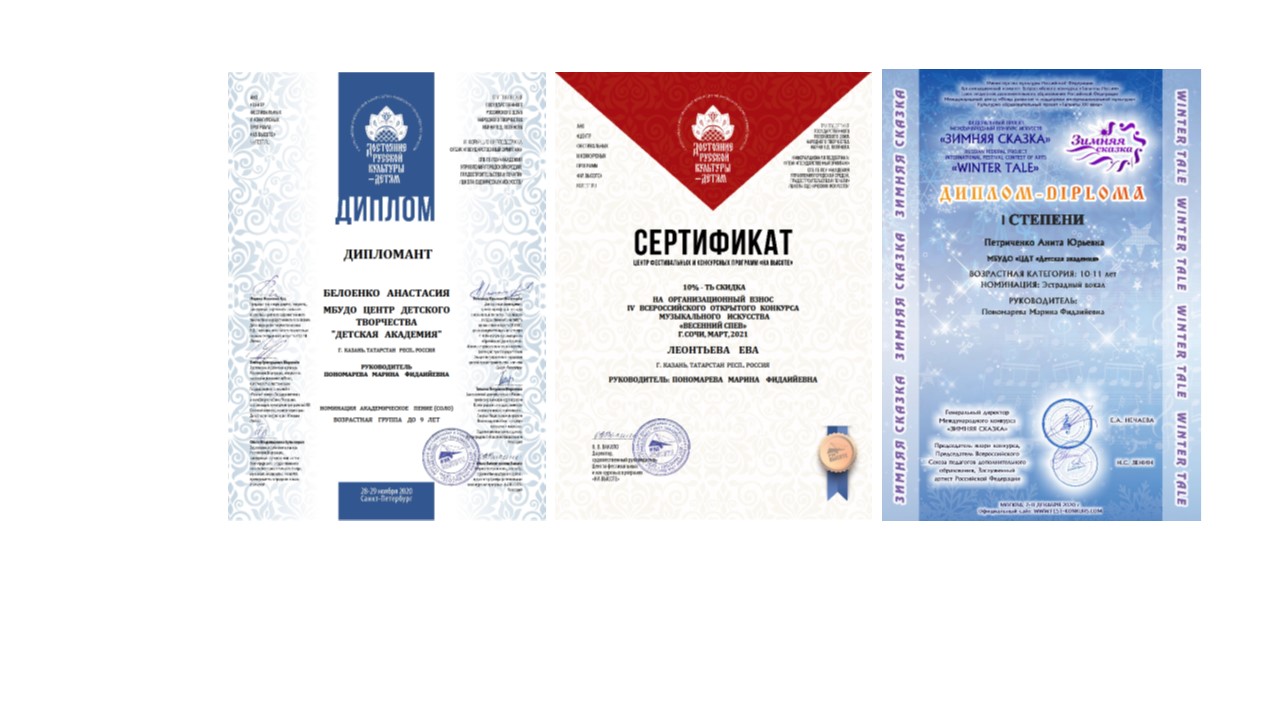 Опубликовано: 21.01.2021Поздравляем вокалистов эстрадной студии с участием в конкурсах различного уровня. Желаем дальнейших побед учащимся и педагогам! /upload/storage/org5336/files/УЧАСТНИК 2120 Петриченко Анита Юрьевна - ЗИМНЯЯ СКАЗКА - ДИПЛОМ УЧАСТНИКА.pdf