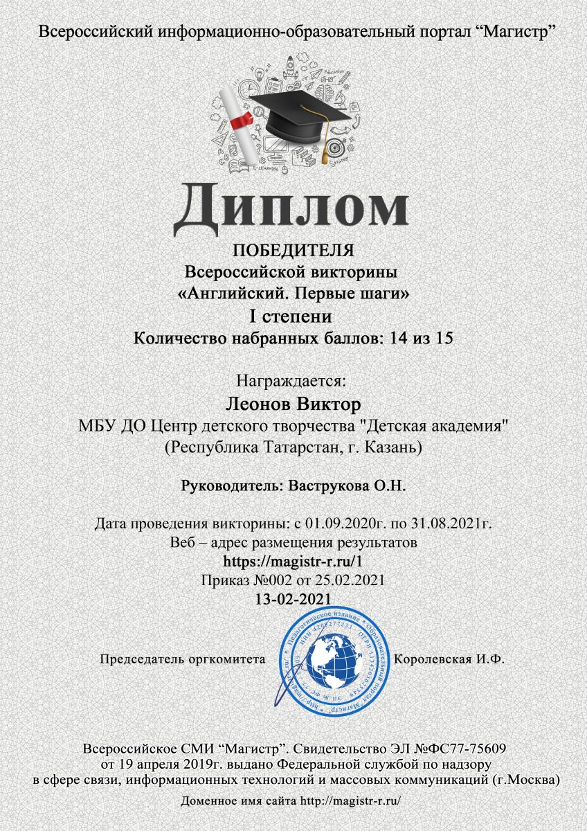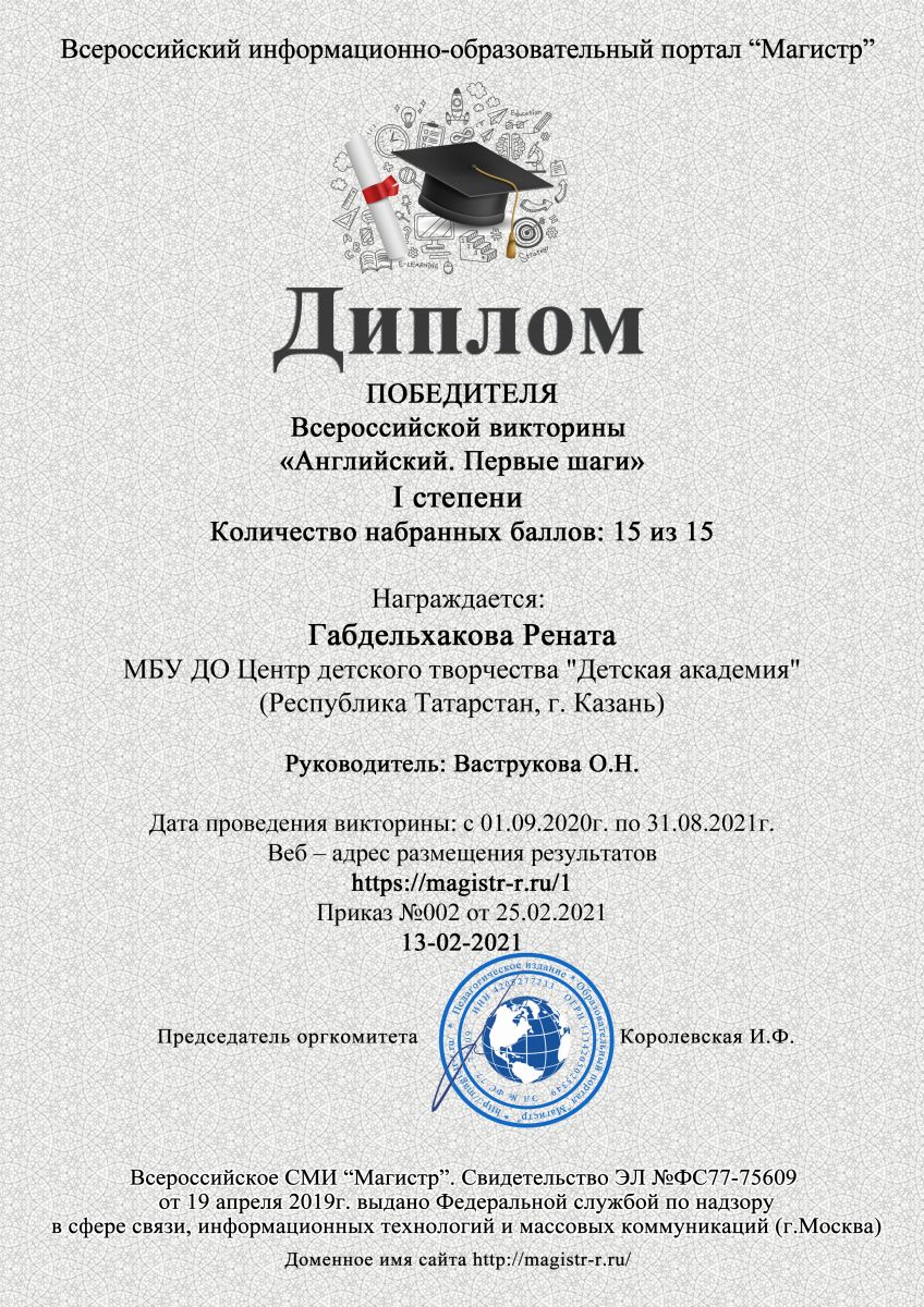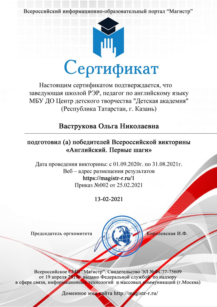 Опубликовано: 15.02.2021Учащиеся школы РЭР поучаствовали во Всероссийской викторине «Английский. Первые шаги» и были награждены Дипломами I степени. За подготовку к викторине благодарим заведующую школы РЭР Ваструкову Ольгу Николаевну.