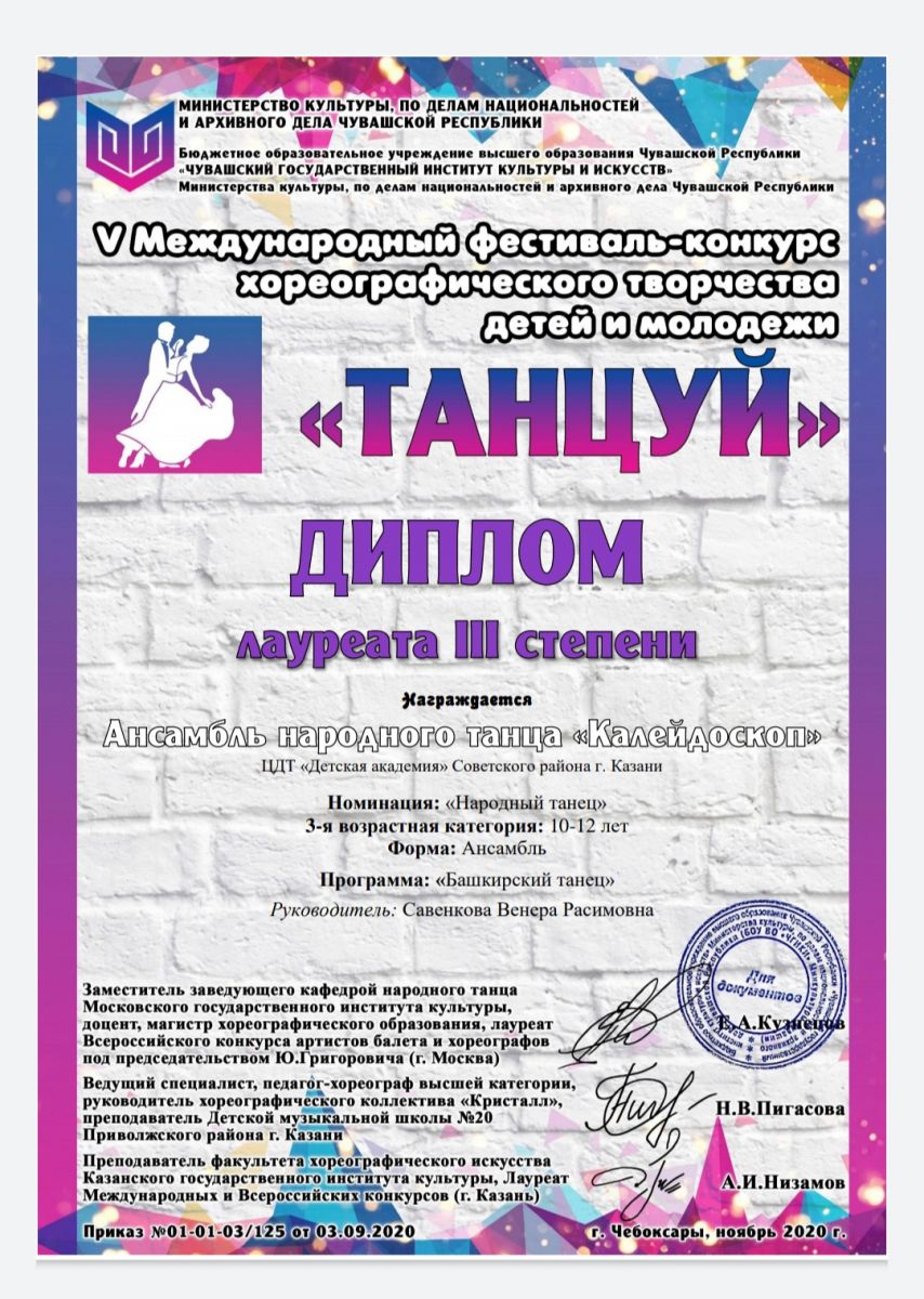 Опубликовано: 17.02.2021Хореографический ансамбль «Калейдоскоп» принял участие в V Международном фестивале -конкурсе хореографического творчества детей и молодежи. И стали Лауреатами III степени. Поздравляем ребят и педагога Савенкову Венеру Расимовну. Желаем дальнейших побед!