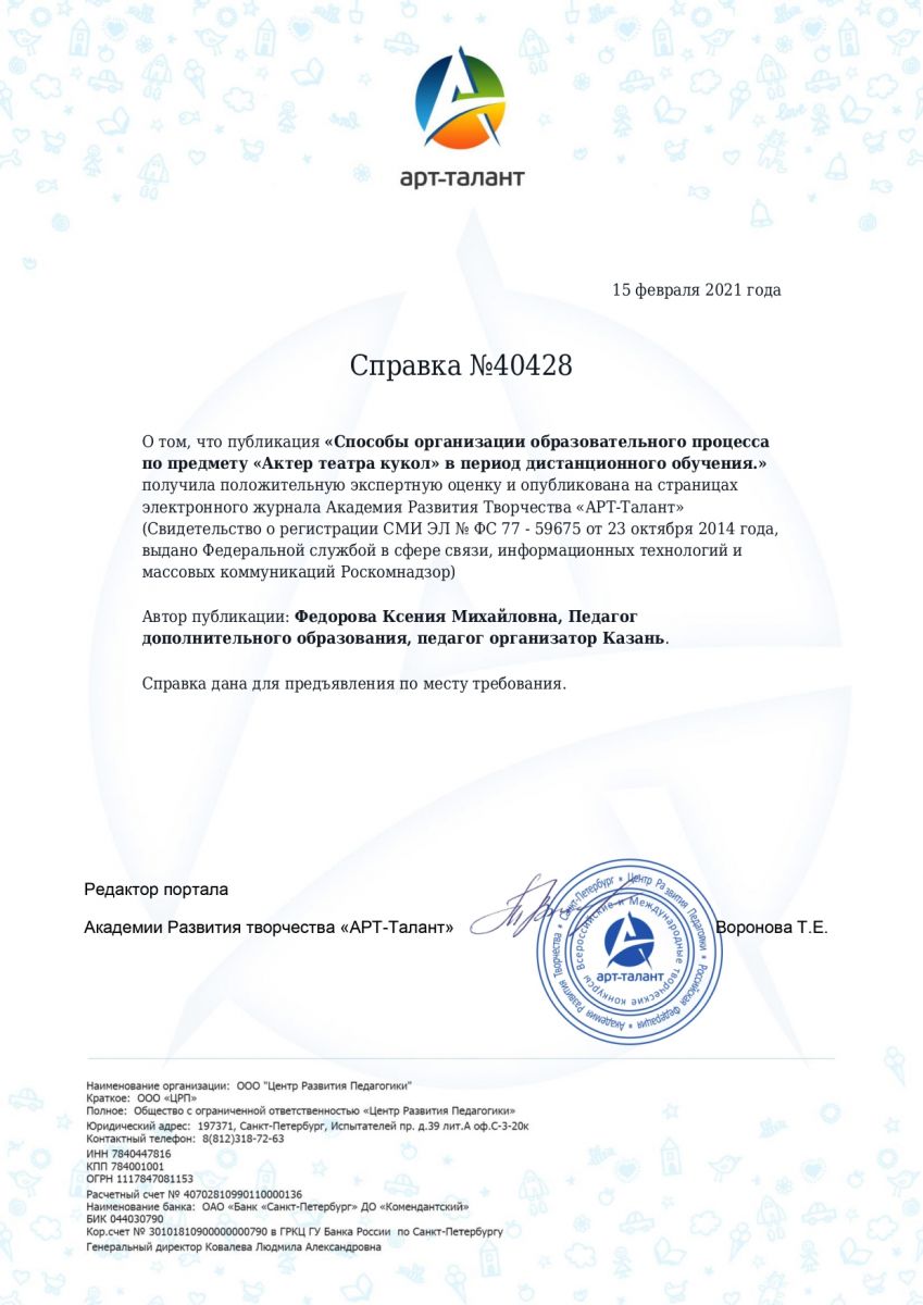 Опубликовано: 18.02.2021Педагог дополнительного образования, педагог организатор Федорова Ксения Михайловна получила свидетельство о публикации материалов на известим сайте «АРТ-талант» www.art-talant.org. На тему «Актер театра кукол» в период дистанционного обучения. Данный методический материал получил положительную экспертную оценку и опубликован на сайте Академии Развития Творчества Настоящее Свидетельство подтверждает публикацию материала на страницах электронного СМИ образовательного характера. Территория распространения: Российская Федерация и зарубежные страны.