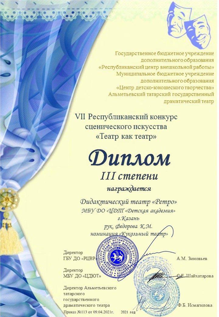 Опубликовано: 20.04.2021Обучающиеся дидактического театра «Ретро» приняли участие в седьмом Республиканском конкурсе сценического искусства «Театр как Театр» и были награждены дипломами третьей степени! Так же ребята были приглашены на выступление в «Городской детский эколого-биологический центр» г. Казани с кукольной постановкой «Три поросенка» и были награждены сертификатом. Поздравляем педагога Федорову Ксению Михайловну и ребят!
