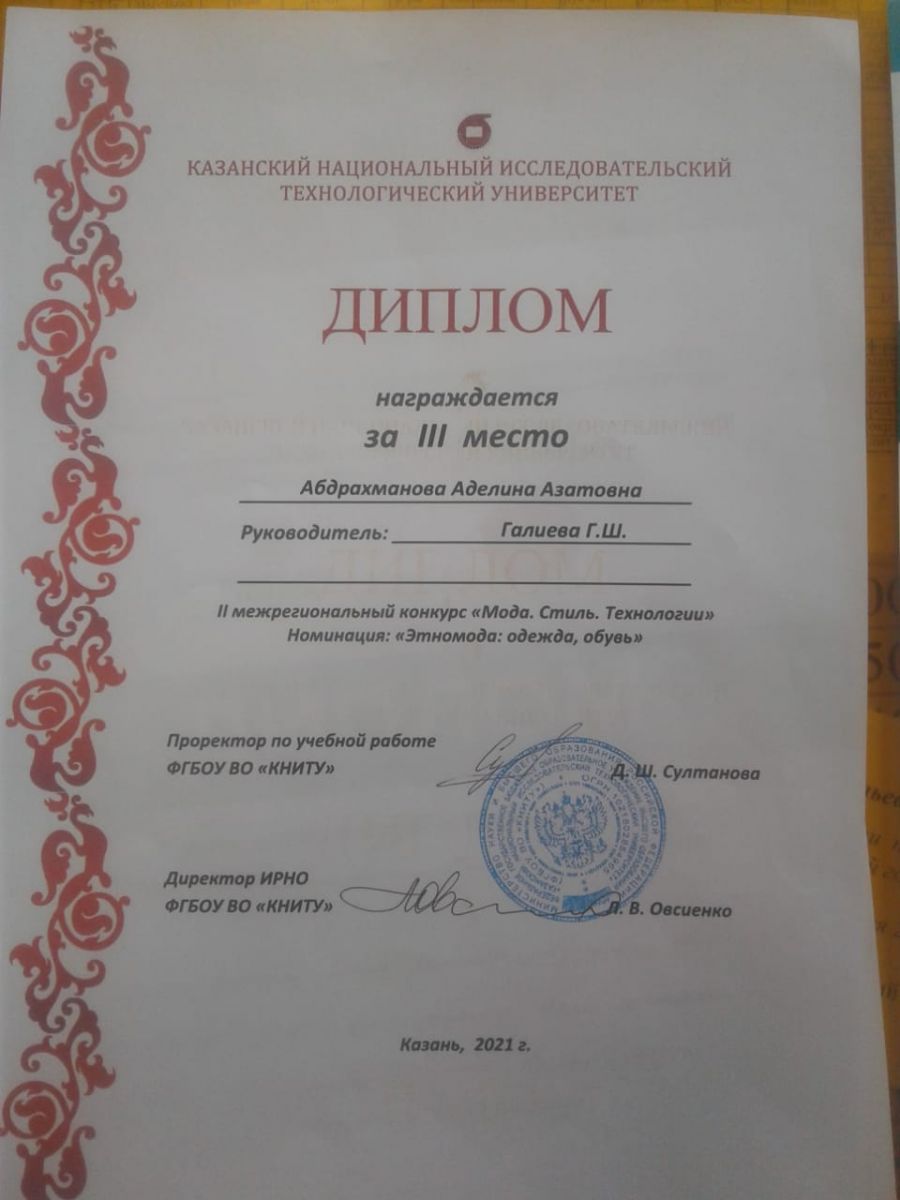 Опубликовано: 23.04.2021Обучающаяся ЦДТ «Детская академия» Абдрахманова Аделина приняла участие во втором Межрегиональном конкурсе «Мода. Стиль. Технологии» в номинации «Этномода одежда и обувь» и была награждена дипломом третьей степени!Обучающаяся ЦДТ «Детская академия» Абдрахманова Аделина приняла участие во втором Межрегиональном конкурсе «Мода. Стиль. Технологии» в номинации «Этномода одежда и обувь» и была награждена дипломом третьей степени!