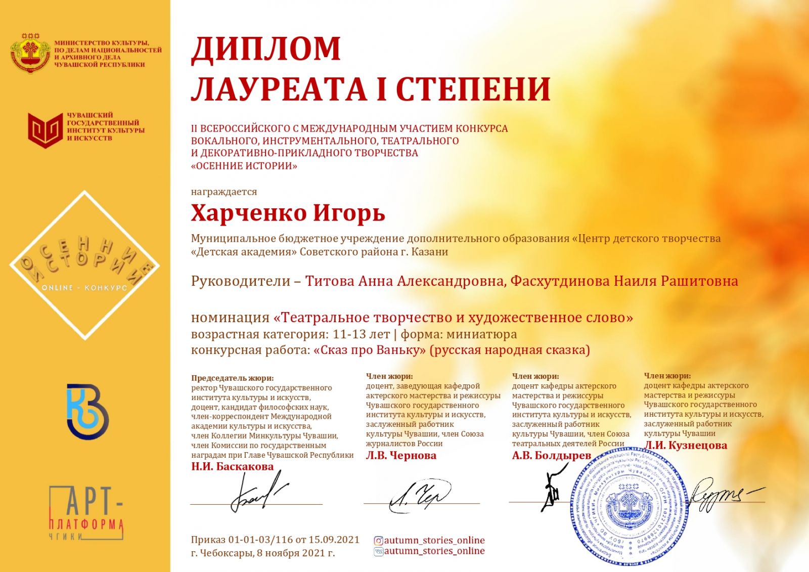 Опубликовано: 24.11.2021ВО ВТОРОМ ВСЕРОССИЙСКОМ С МЕЖДУНАРОДНЫМ УЧАСТИЕМ КОНКУРСЕ ВОКАЛЬНОГО, ИНСТРУМЕНТАЛЬНОГО, ТЕАТРАЛЬНОГО И ДЕКОРАТИВНО-ПРИКЛАДНОГО ТВОРЧЕСТВА «ОСЕННИЕ ИСТОРИИ» ПРИНЯЛ УЧАСТИЕ ХАРЧЕНКО ИГОРЬ И БЫЛ НАГРАЖДЕН ДИПЛОМОМ ЛАУРЕАТА ПЕРВОЙ СТЕПЕНИ. ПЕДАГОГИ ТИТОВА А.А., ФАСХУТДИНОВА Н.Р.