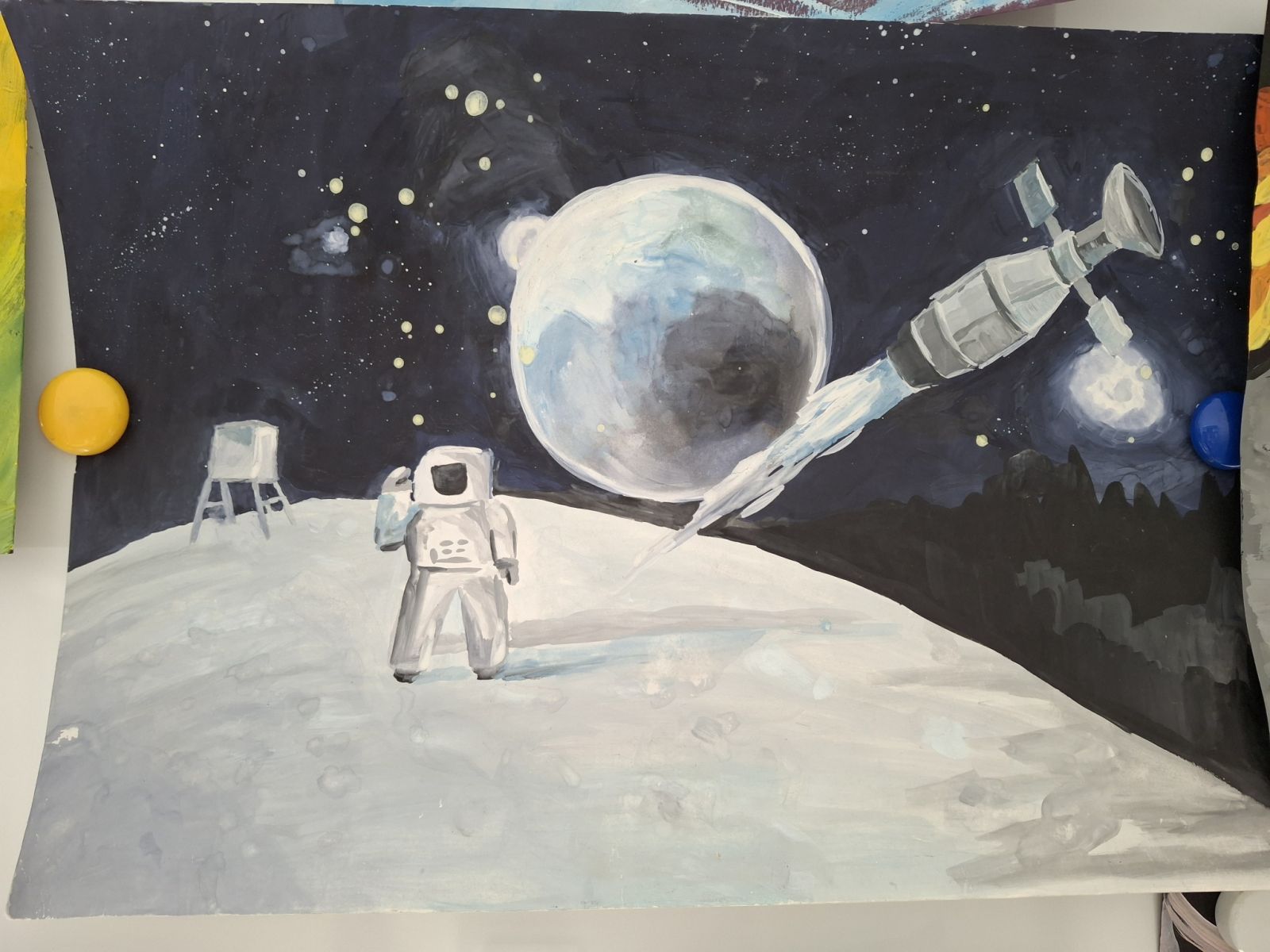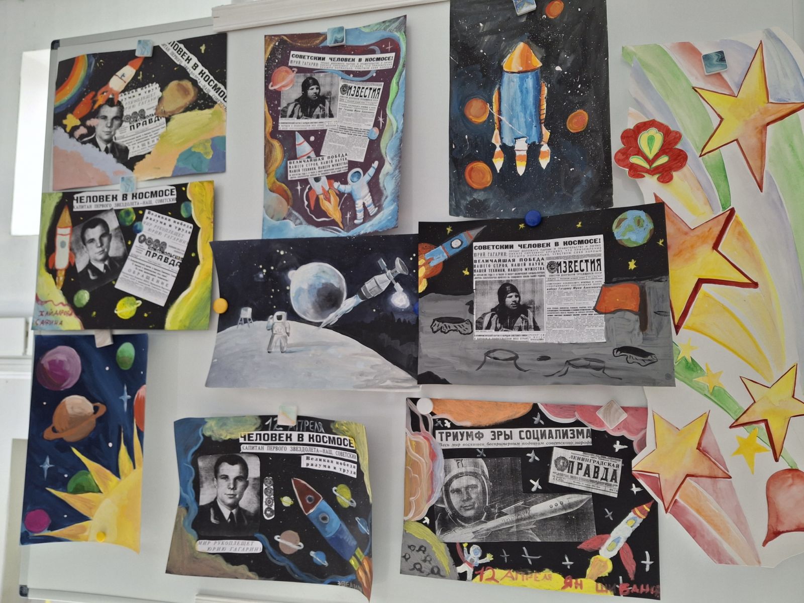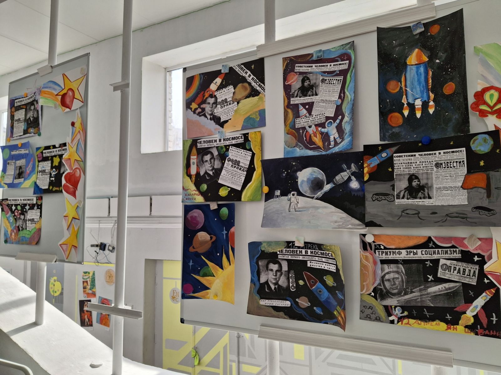 12 апреля 2026 года исполнилось 65 лет со дня первого полёта человека в космос — полёта Юрия Алексеевича Гагарина на космическом корабле «Восток». Свои рисунки-коллажи, посвященные этому событию разместили в фойе детского центра обучающиеся художественного объединения "Вдохновение" (рук. Мухаметзянова С.Р.). Детский рисунок ребят сочетается с вырезками из газет, журнальных статей и фотографиями на тему космоса.