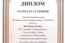 Лауреатом 1 степени городского конкурса чтецов «В сердцах, в умах, на языках вечный Г. Тукай – 2017» в номинации «Стихотворения Г.Тукая, не входящие в школьную программу» стал Шангараев Йосуф (театральная студия «