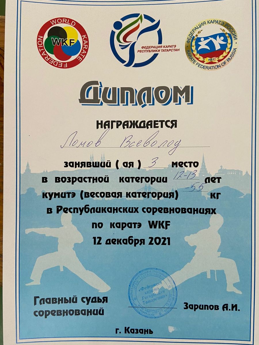 Поздравляем победителя Республиканских соревнований по каратэ WKF Ломова Всеволода, 3 место, педагог ЦДТ "Танкодром" Осипова Л.А.