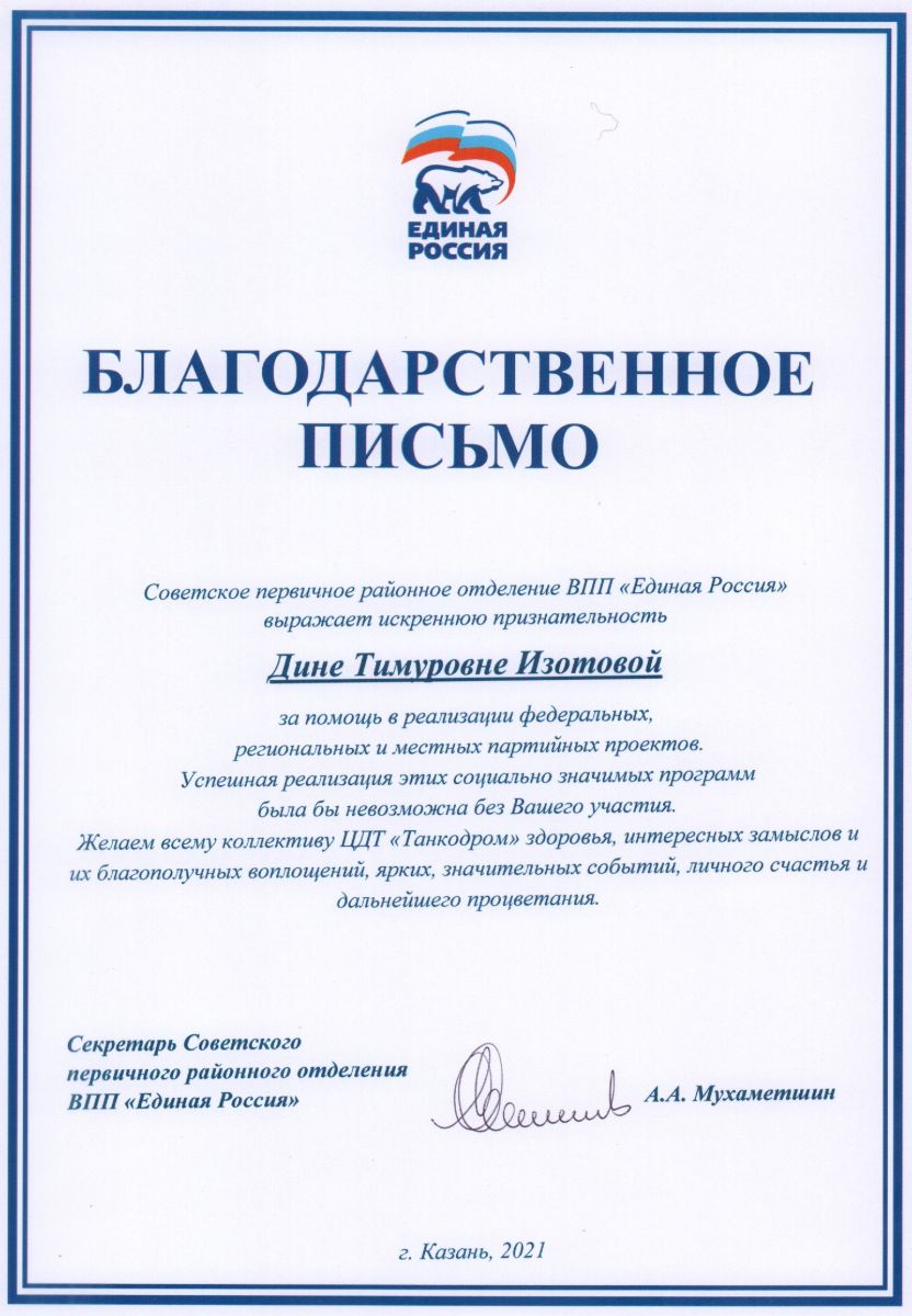 Советское первичное районное отделение ВПП "Единая Россия" выразил благодарность директору ЦДТ "Танкодром" Дине Тимуровне Изотовой за помощь в реализации федеральных, региональных и местных партийных проектов.