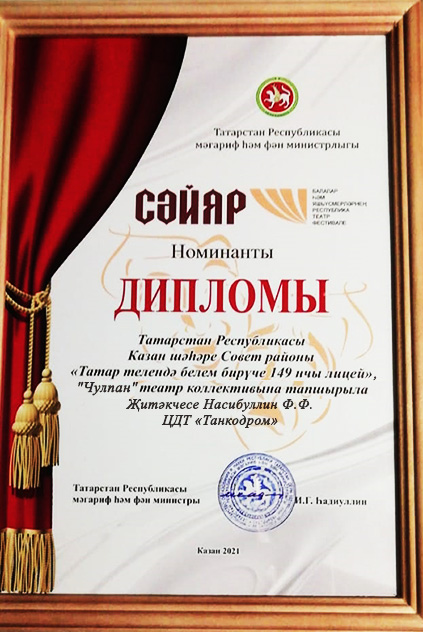 Поздравляем дипломанта фестиваля театральный коллектив "Чулпан" ЦДТ "Танкодром" под руководством педагога Насибуллина Ф.Ф.!