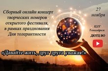 Уже сегодня, 27 ноября 2020 года, на YouTube канале ДЮТЦ «Васильевский остров» состоится сборный онлайн концерт творческих номеров открытого Фестиваля, в рамках празднования Дня толерантности «Давайте жить, друг друга уважая!», в котором принимают участие творческие коллективы: