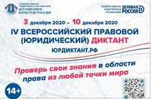 С 3 по 10 декабря 2020 года будет проводится акция «Всероссийский правовой диктант» 2020 или Юридический диктант! Знаете ли вы о своих правах? А может быть вы увлекаетесь юриспруденцией? В любом случае, вам точно нужно принять участие в этой акции! Ведь это отличный способ проверить себя и узнать много нового! И ещё – всё участники акции получат сертификаты!