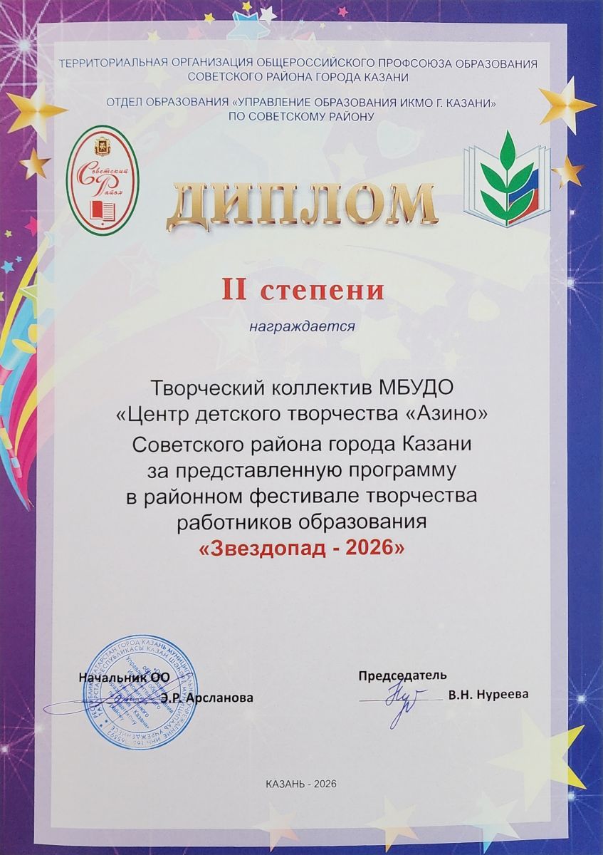 На районном фестивале «Звездопад» творческий коллектив Центра детского творчества "Азино" под руководством Галеевой Елены Валерьевны занял почетное 2 место.