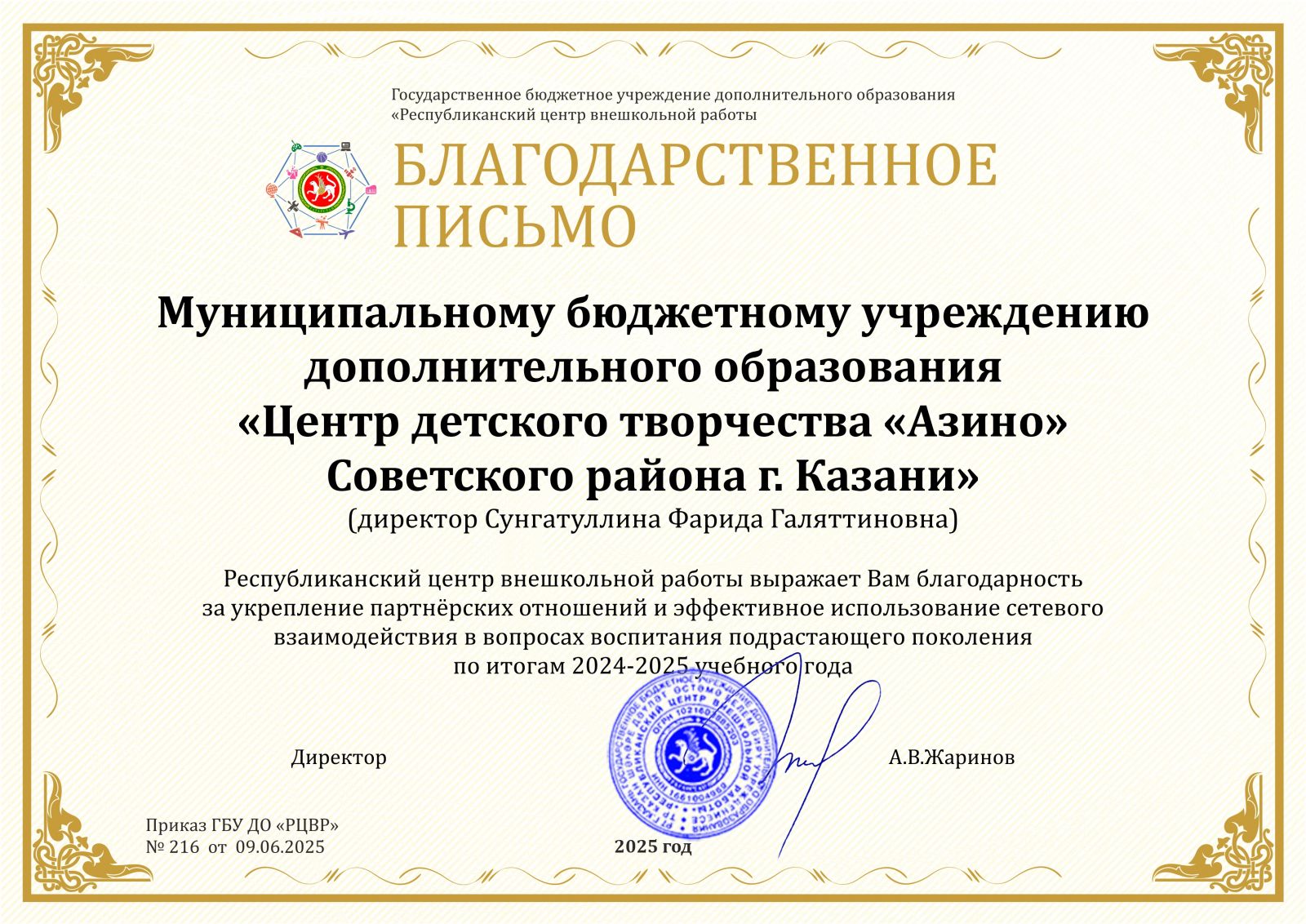 16.06.25 г. прошла стажировка ГАОУ ДПО "Институт развития образования Республики Татарстан" Отдел Управления образования Исполнительного комитета муниципального образования по Советскому району г. Казани по теме: " Аналитико-диагностическая деятельность руководителя, методиста в развитии творческого потенциала педагогического коллектива (из опыта работы МБУДО "ЦДТ "Азино").