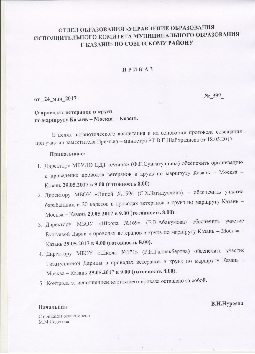 Опубликовано: 29.05.2017Приказ "О проводах ветеранов в круиз по маршруту Казань-Москва-Казань"