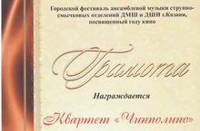 20 марта в Детской музыкальной школе №1 им. П.И.Чайковского состоялся Городской фестиваль ансамблевой музыки струнно-смычковых отделений ДМШ и ДШИ г.Казани, посвященного Году российского кино. В концерте приняли участие квартет "Чиполлино" (рук.Карпова О.А., Аорнольдова И.Р., Рафикова Д.А.) и Ансамбль струнно-смычковых инструментов ДШИ №4 "Аллегретто" (рук. Карпова О.А., Арнольдова И.Р. конц.Хамидов Р.Р.).