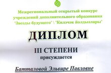 Директор ДШИ № 6 Батталова Эльвира Павловна - дипломант III степени конкурса учреждений дополнительного образования детей «Звезды будущего». 04.03.2017