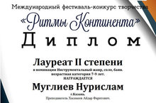 На I Международном фестивале-конкурсе творчества «Ритмы континента», прошедшем в Самаре, Муглиев Нурислам удостоен звания лауреата 2 степени!