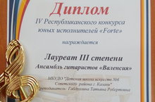 26 апреля ансамбль гитаристов «Валенсия» дебютировал на сцене ДШИ № 15, где проходил IV Республиканский конкурс юных исполнителей «Forte», и стал лауреатом 3 степени. Поздравляем участников и руководителя коллектива Габдуллину Татьяну Робертовну с премьерным успешным выступлением!