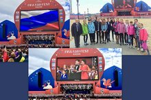 Возле Центра семьи «Казан», 14 июня начался Фестиваль болельщиков FIFA Fan Fest.Тысячи казанцев ( и конечно,преподаватели ДШИ № 6)и гостей города пришли смотреть Открытие Чемпионата мира по футбола и матч сборной России с командой Саудовской Аравии, у "Чаши", на огромных экранах в парке болельщиков. К открытию ЧМ был приготовлен гигантский чак-чак,формой и расцветкой в пол-футбольного мяча. На главной сцене площадки мы смотрели приветствие Чемпионату Президента Республики Татарстан Рустама Минниханова и выступления лучших коллективов Татарстана.