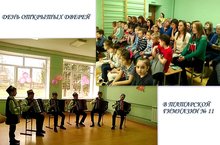 28го апреля в татарской гимназии № 11 прошел День открытых дверей. В празднике для будущих первоклассников и их родителей выступили обучающиеся ДШИ № 6: вокалисты Краснов Семён, Мухутдинова Ясмина (класс преподавателя Нугмановой Л.И.) и ансамбль баянистов (руководитель Гужова Н.В.).