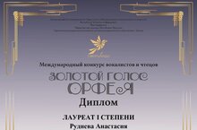 Поздравляем Рудневу Анастасию Витальевну - Лауреата I степени Международного конкурса вокалистов и чтецов "Золотой голос Орфея"! Желаем дальнейших творческих успехов и новых побед!