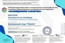 Камерный хор "Gloria" (руководитель: Уварова Лариса Рудольфовна, концертмейстер: Сергеева Елизавета Александровна) - Лауреат III степени