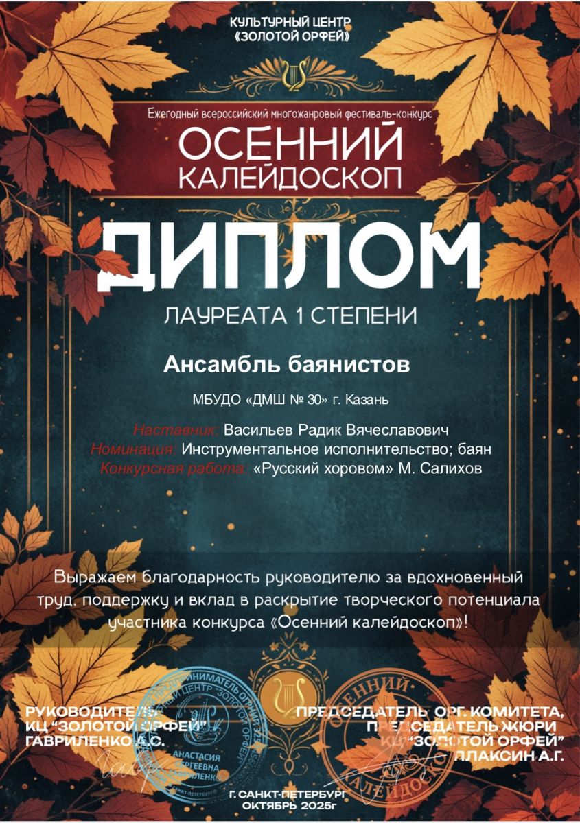 VIII Всероссийский конкурс исполнителей на народных инструментах "Русская палитра" (г.Москва) - учащиеся в составе детского оркестра народных инструментов г.Казани под упр. Занозовских