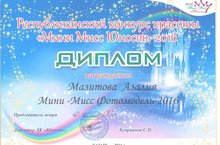 Наша Юная звездочка - Мазитова Азалия победила в Республиканском конкурсе красоты "Мини Мисс Юность - 2016" в номинации "Мини-Мисс Фотомодель - 2016"!