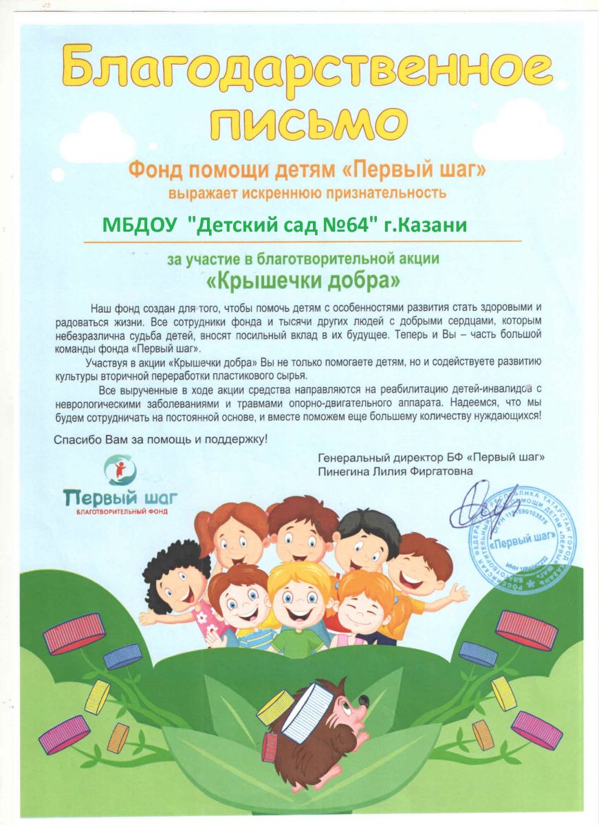 За помощь природе и детям наш Детский сад получил благодарственное письмо от Фонда помощи детям «Первый шаг».