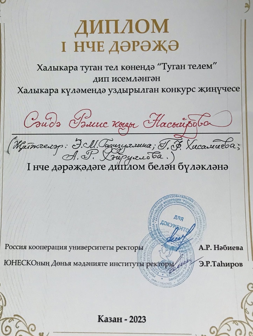 Поздравляем Насырову Саиду, воспитанницу группы "Тамчылар" с заслуженным 1 местом. Гордимся и любим!!!