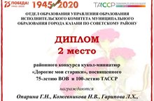 Поздравляем педагогов нашего коллектива Опарину Г.Н., Кожевникову Н.В., Гарипову Л.Х., с победой в районном конкурсе кукол-миниатюр "Дорогие мои старики", посвященного 75-летию ВОВ и 100-летию ТАССР.