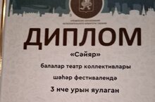 Накануне в театре им. Кариева подвели итоги детского творческого фестиваля «Сайяр». В фестивале приняли участие около 2,3 тыс. воспитанников из 78 школ и 110 детских садов. Конкурс состоял из трех этапов — муниципальный, районный, городской. В течение трех месяцев конкурсанты представили свои театральные постановки.Оценивали конкурсантов действующие актеры и артисты, театральные деятели. По итогам конкурса жюри присудило театральному коллективу нашего детского сада 3 место. Поздравляем наших юных артистов и руководителей театрального коллектива "Алтын алма" с такой значимой победой!
