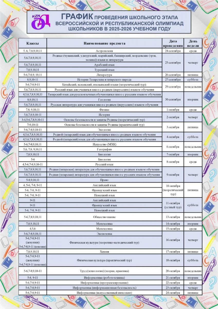 Школьный этап Всероссийской и Республиканской олимпиады школьников 2025-26 учебного года будет проходить с 24 сентября по 24 октября. Всем желаем успехов и новых побед!
