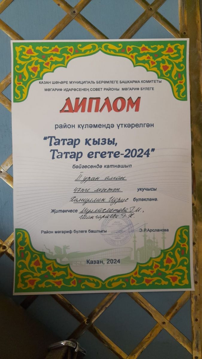 Ученик 10 класса Халиуллин Идрис принял участие в районном туре городского конкурса "Татар кызы, Татар егете 2024" и занял 2 место.