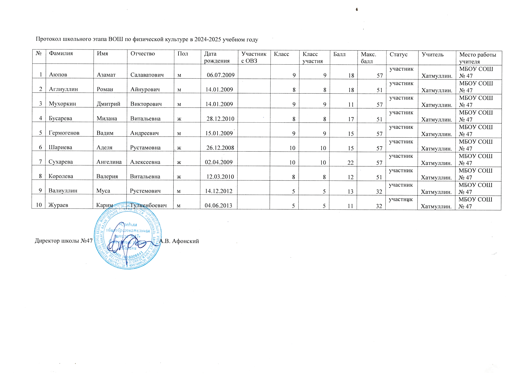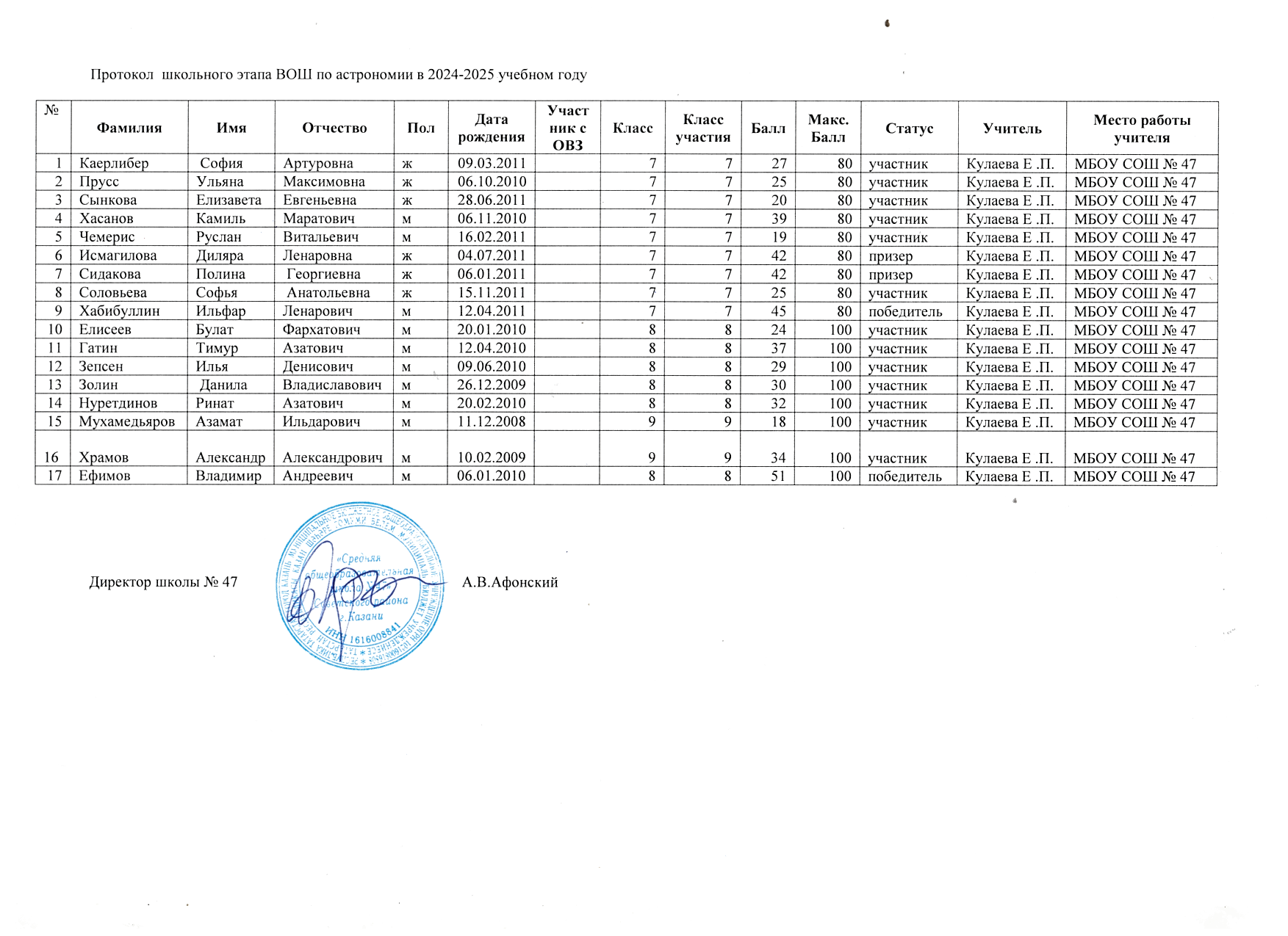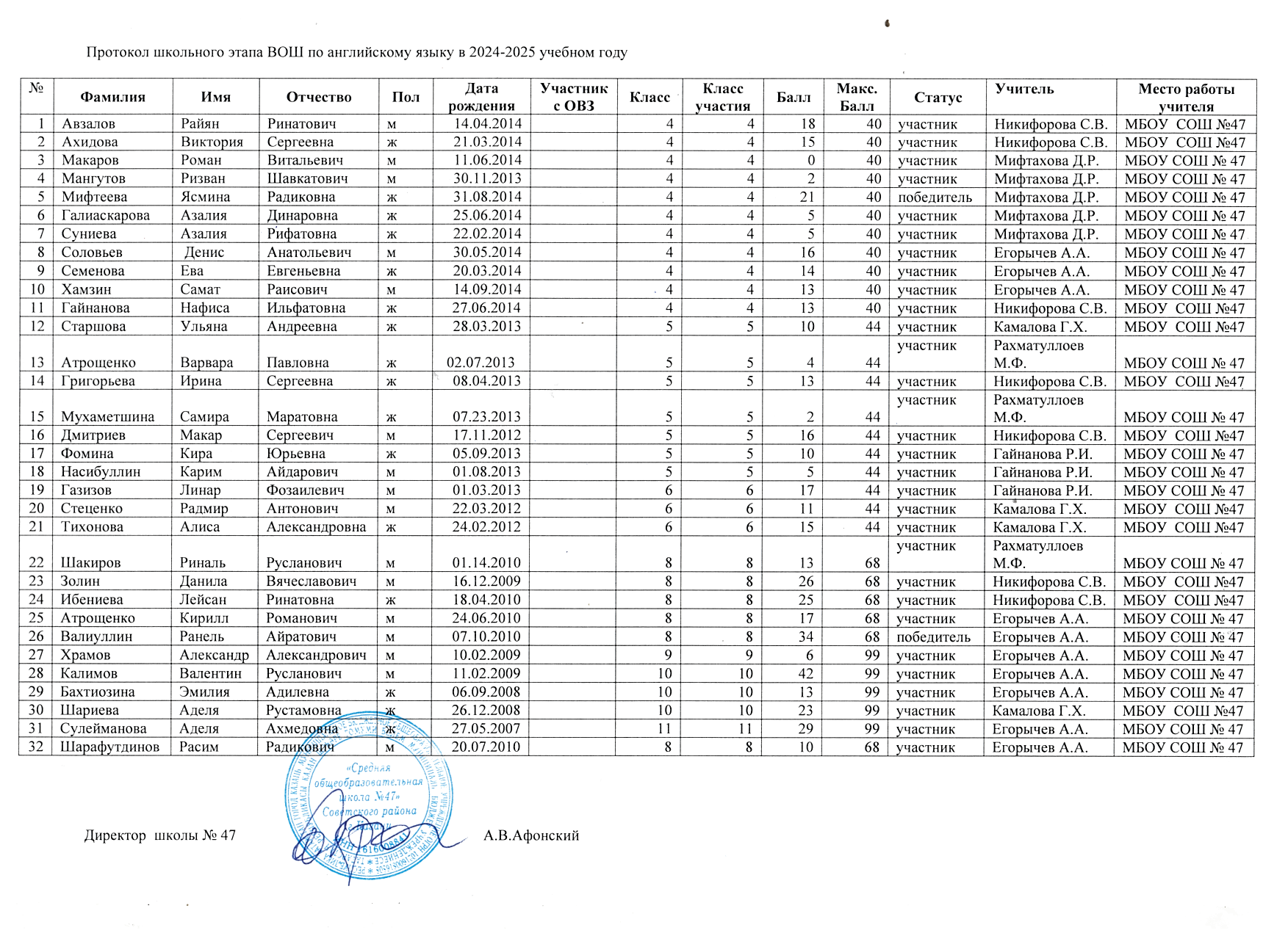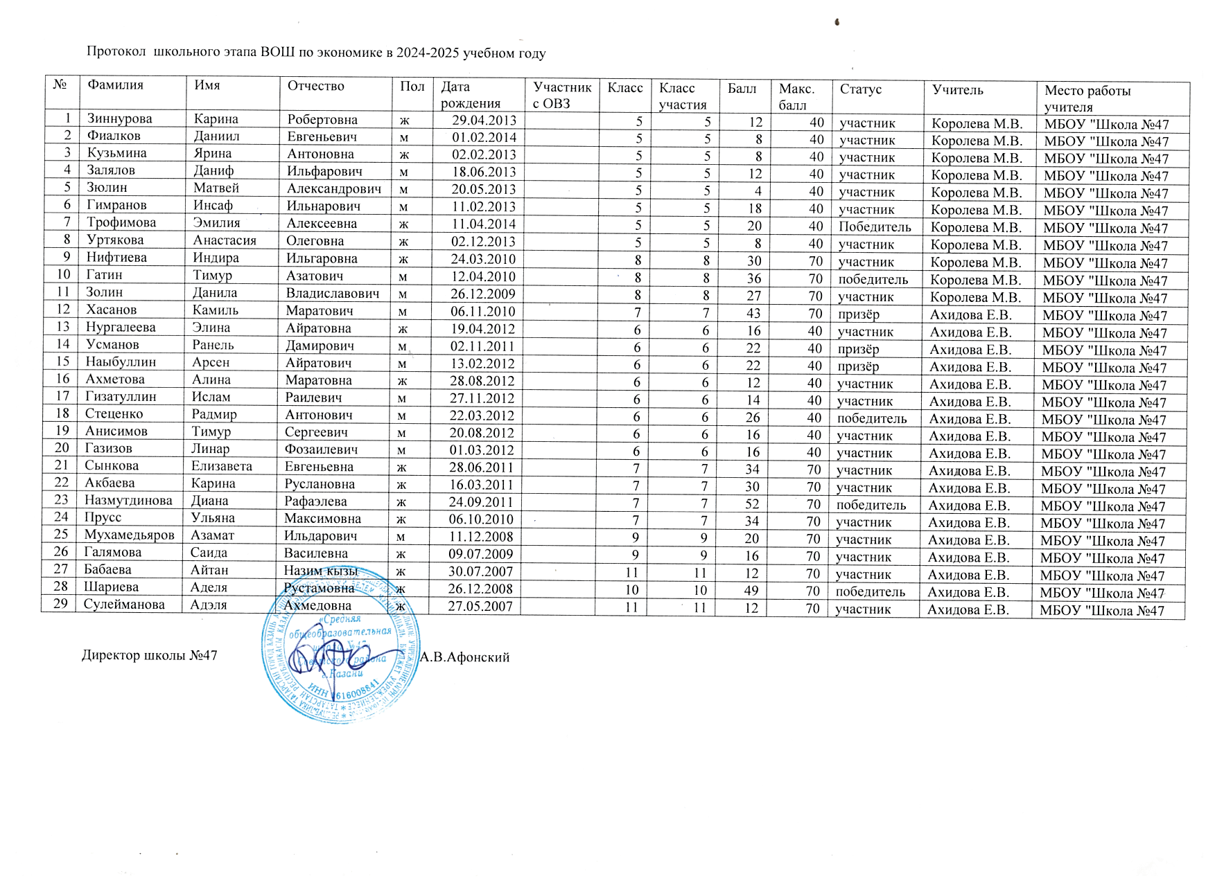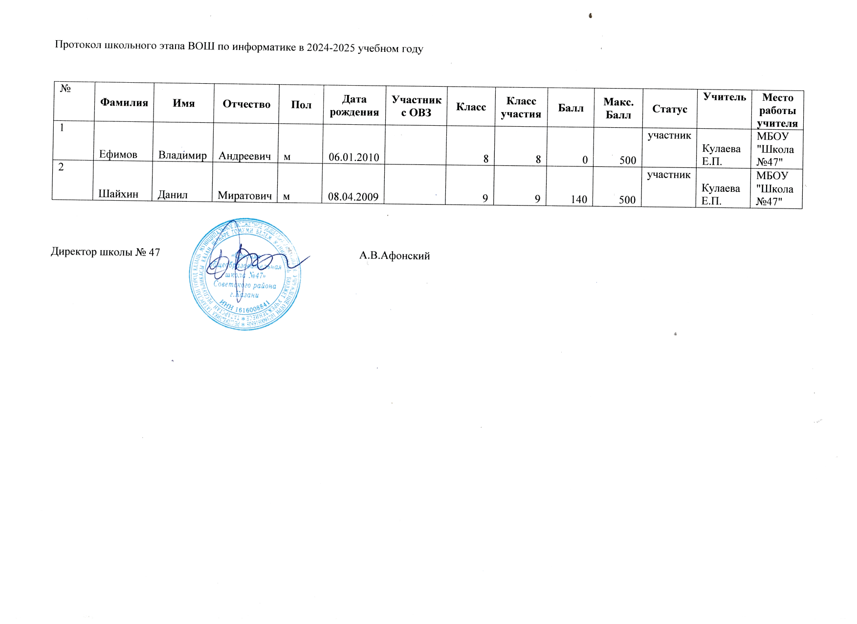Протоколы школьного этапа Всероссийской олимпиады школьников по предметам: