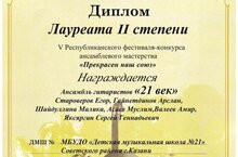 Ансамбль гитаристов «21 век» (Яксяргин Сергей Геннадьевич, Валеев Амир, Асаев Муслим, Гайнетдинов Арслан, Шайдуллина Малика, Староверов Егор) под руководством преподавателя Яксяргина Сергея Геннадьевича, стал лауреатом II степени на V Республиканском фестивале-конкурсе ансамблевого мастерства «Прекрасен наш союз»!