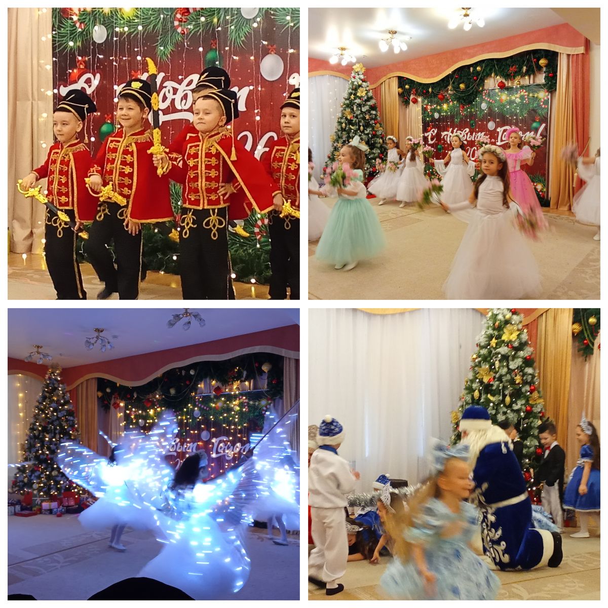 С 23 по 26 декабря в нашем детском саду были проведены новогодние утренники во всех возрастных группах. Сказочно украшенный музыкальный зал, сверкающие огоньки, нарядная ёлка, увлекательные танцы и хороводы, стихи, загадки, веселые игры подарили ребятам и их родителям праздничное новогоднее настроение. Восторженные эмоции переполняли всех присутствующих в зале – и детей, и гостей. Ребята были в восторге от неожиданных новогодних сюрпризов и встреч с веселыми героями.
