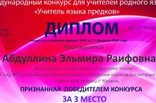 Поздравляем воспитателя по обучению татарскому языку Абдуллину Эльмиру Раифовну, занявшую 3 место в международном конкурсе для учителей родного языка, организованном фондом поддержки родных языков «Язык предков»!