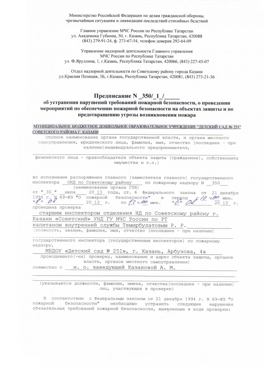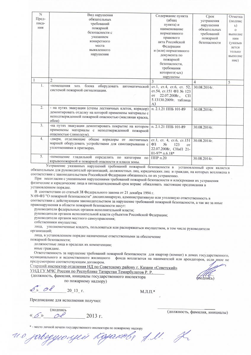 Предписание об устранении нарушений требований пожарной безопасности (стр. 1)