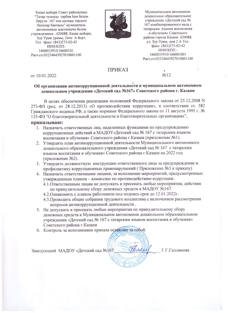 Приказ об организации антикоррупционной деятельности в МАДОУ №167
