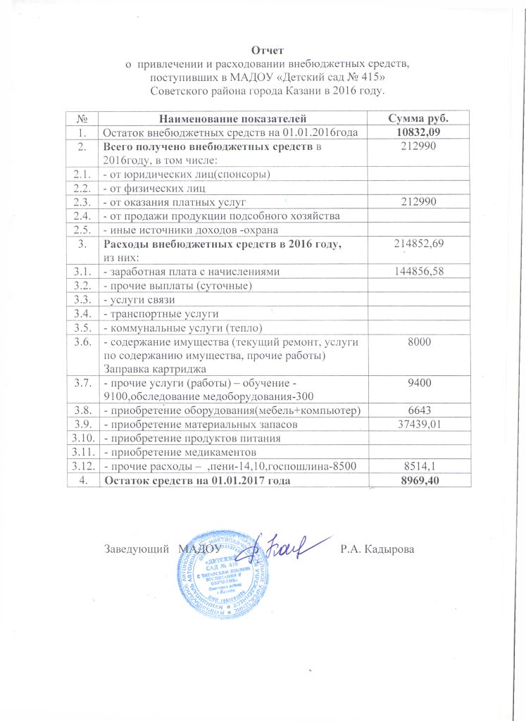 Отчет о привлечении и расходовании внебюджетных средств, поступивших в  МАДОУ "Детский сад № 415" в 2016 году