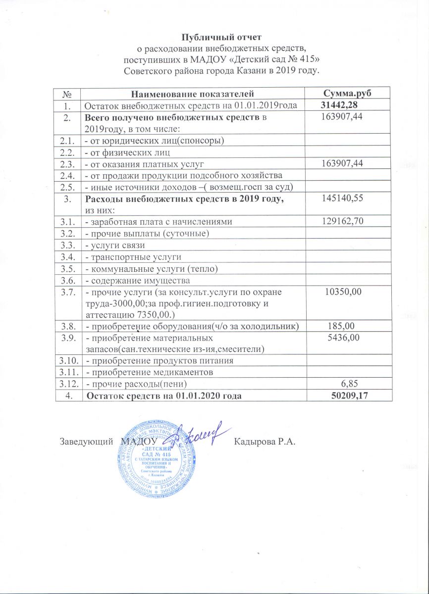 Отчет о привлечении и расходовании внебюджетных средств, поступивших в  МАДОУ "Детский сад № 415" в 2019 году