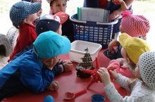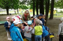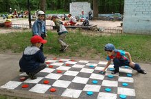 Летом дети продолжают узнавать новое на развивающих точках, расположенных прямо на территории детского сада. Играют в шашки.