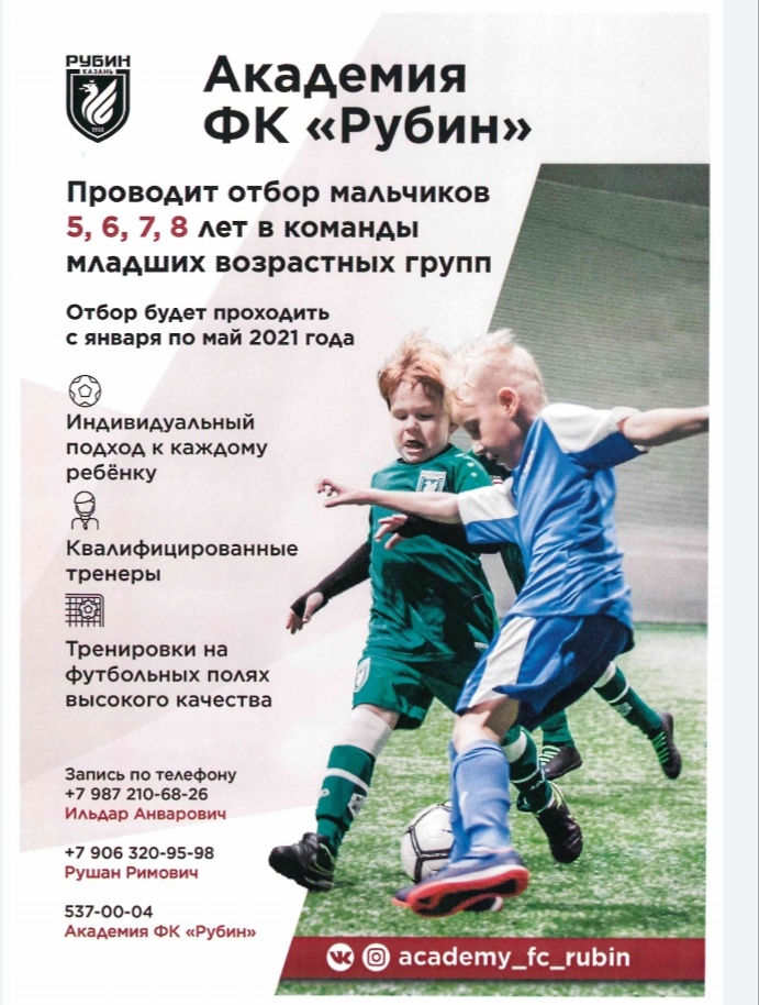 Уважаемые родители! Академия ФК "Рубин" проводит отбор мальчиков 5,6,7,8 лет в команды младших возрастных групп. Отбор будет проходить с января по май 2021года