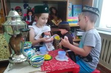 В летний оздоровительный период проводится работа по изучению детьми татарского языка в интересной и развлекательной форме. Сегодня дети познакомились с куклами Гөмәр и Гөлбикә которые говорят на татарском языке.