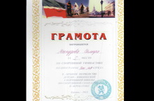Грамотой за 1 место по спортивной гимнастике по программе 3 юн. разряда в личном первенстве детско - юношеской спортивной школы по спортивной гимнастике и акробатике